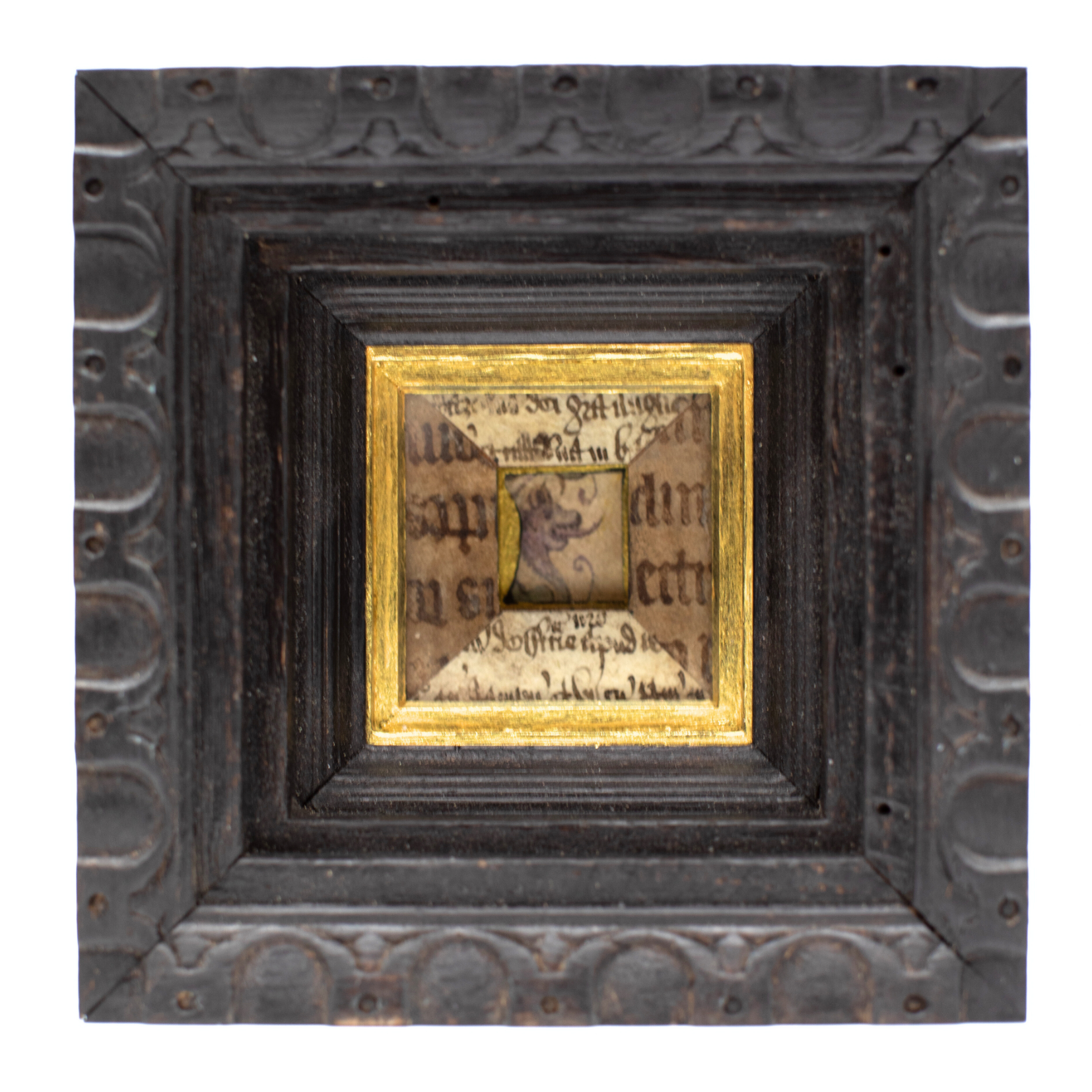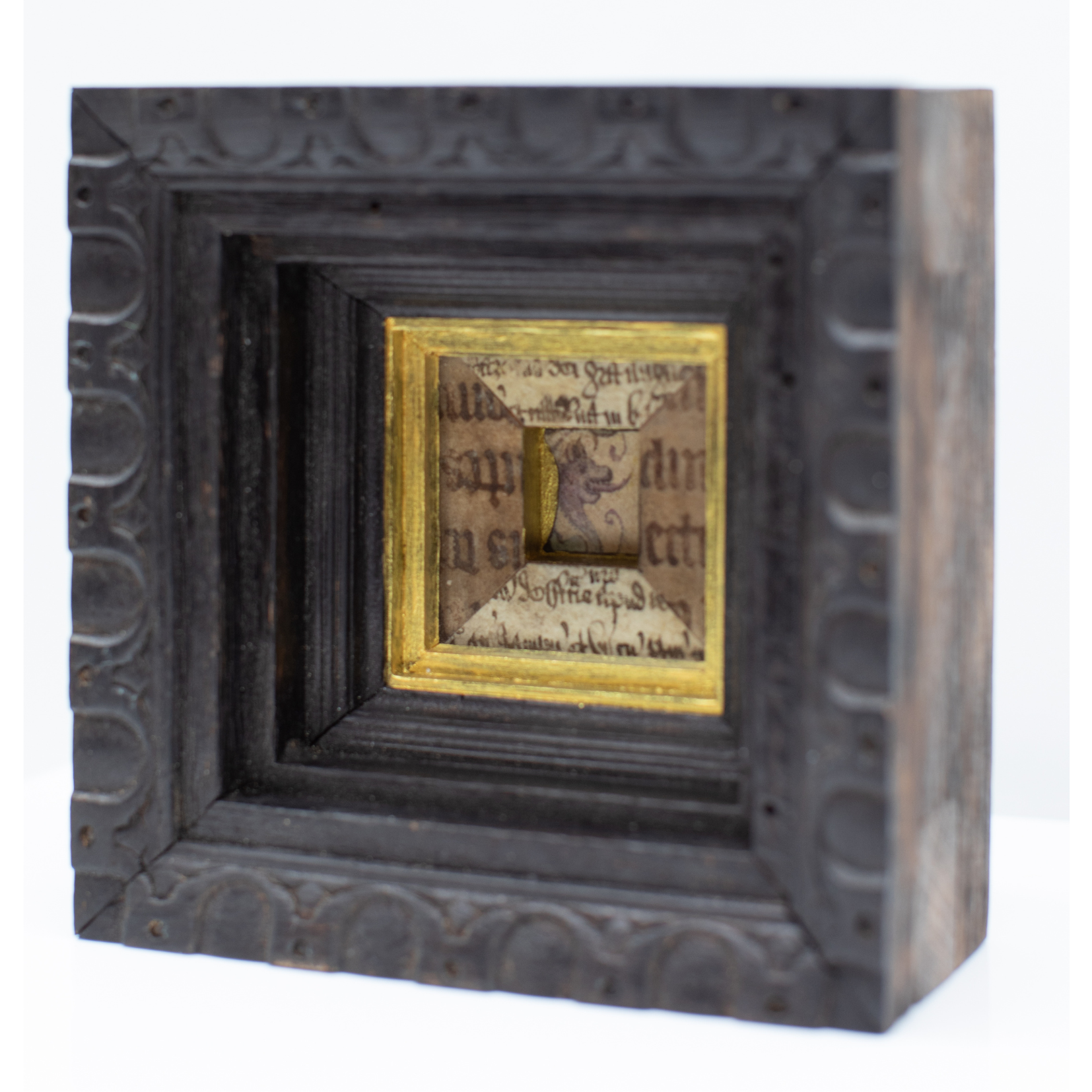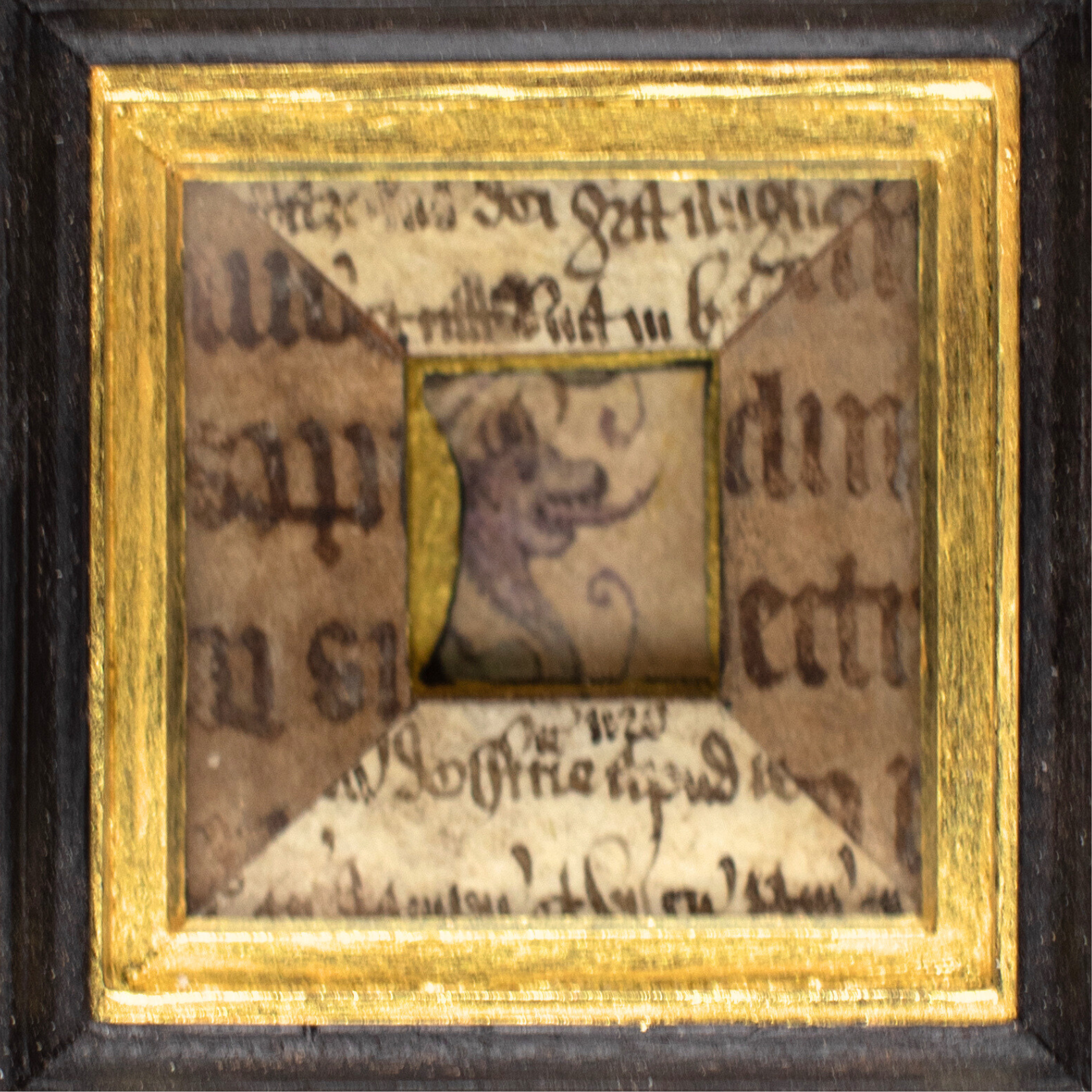 Details: At the heart of this assemblage lies the painted head of a dog, sitting watch amid fragments of medieval text. The surrounding script drawn from 14th and 16th century vellum pastedowns, carry the weight of centuries, words once spoken now reduced to whispering traces.