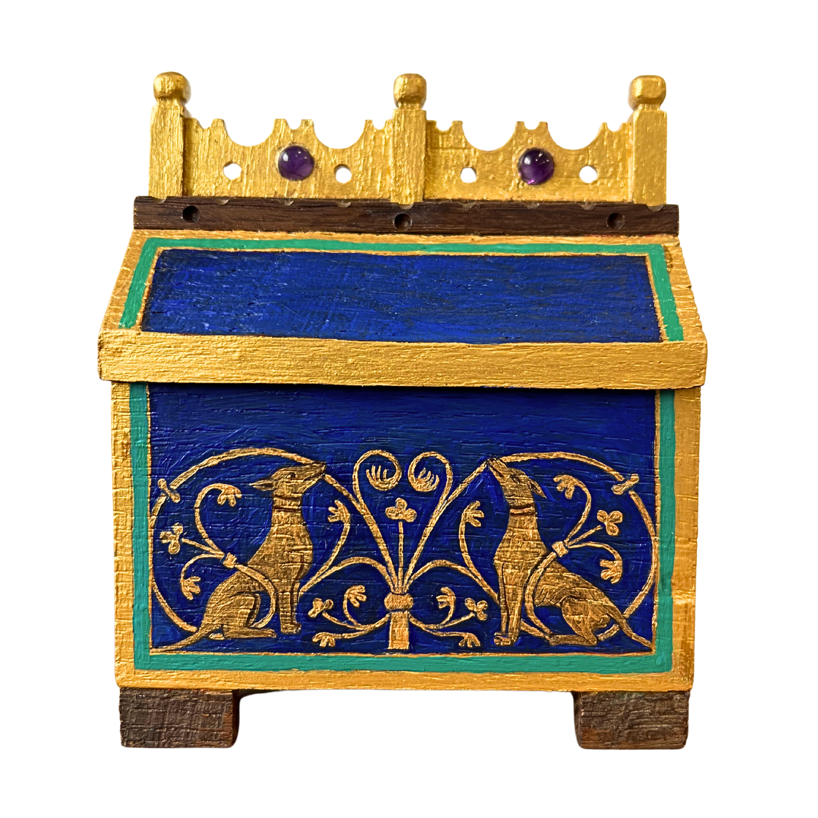 This casket is not a container. It is a consecration of what remains. A shrine to shelter, fracture, and the sacred persistence of form. It has been hand-painted in oils by Venetia Higgins who took inspiration from medieval reliquary boxes and medieval church ceilings.