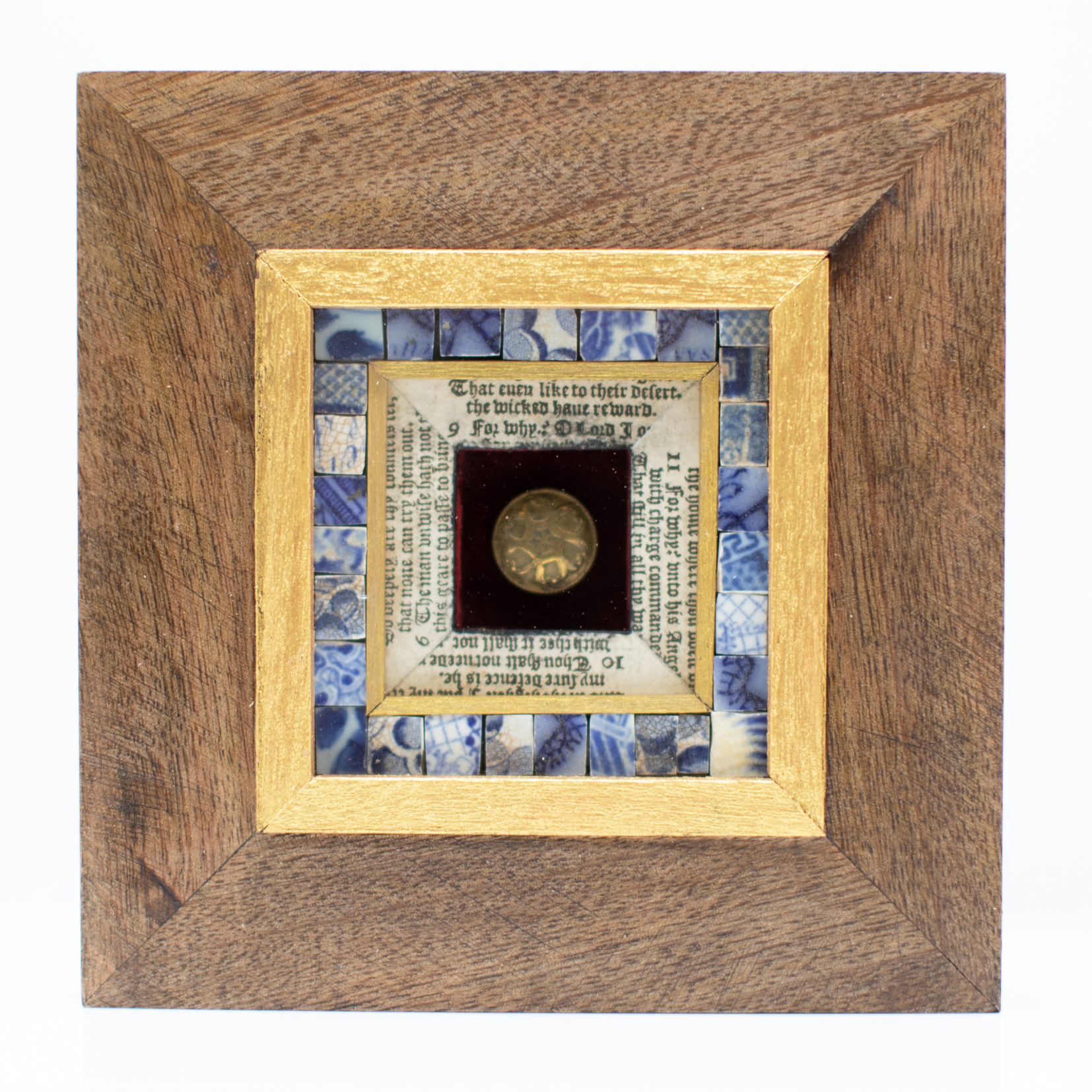 Details: A field found button anchors this elegy of fragments-once worn once fastened to a body now orphaned from its purpose. Around it, 17th Century religious text murmurs with disillusionment, its voice faded but not silenced. River found pottery shards encircle the relic like a domestic ghost - vessels of nourishment, now broken and adrift.