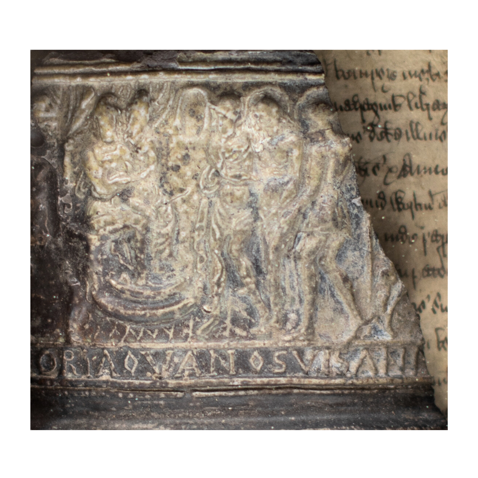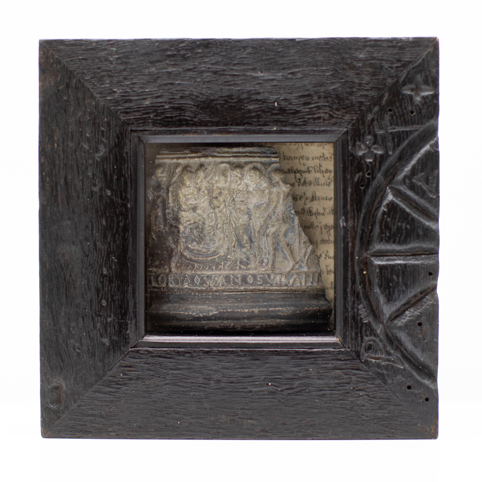 Details: This 17th century Oak frame was once part of a porch timber, with a possible witch mark graffitied onto it to ward off evil and bad luck. It now holds a fragment of 16th century Raeren stoneware depicting the peasants or paupers dance. This motif, echoed in paintings of that time, speaks to a shifting social order: celebration as resistance, and festivity as rupture.